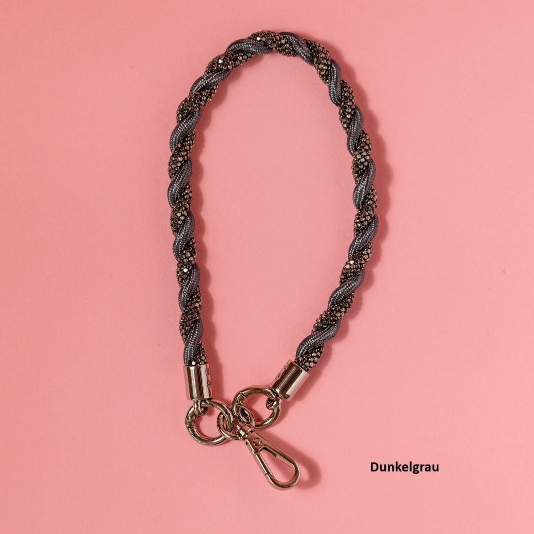 Hier wird das Glitter Rope mit Fabric Phone Straps getwisted und mit hochwertigen Karabiner und O-Claps versehen. Somit gibt es 2 Verschlussmöglichkeiten.