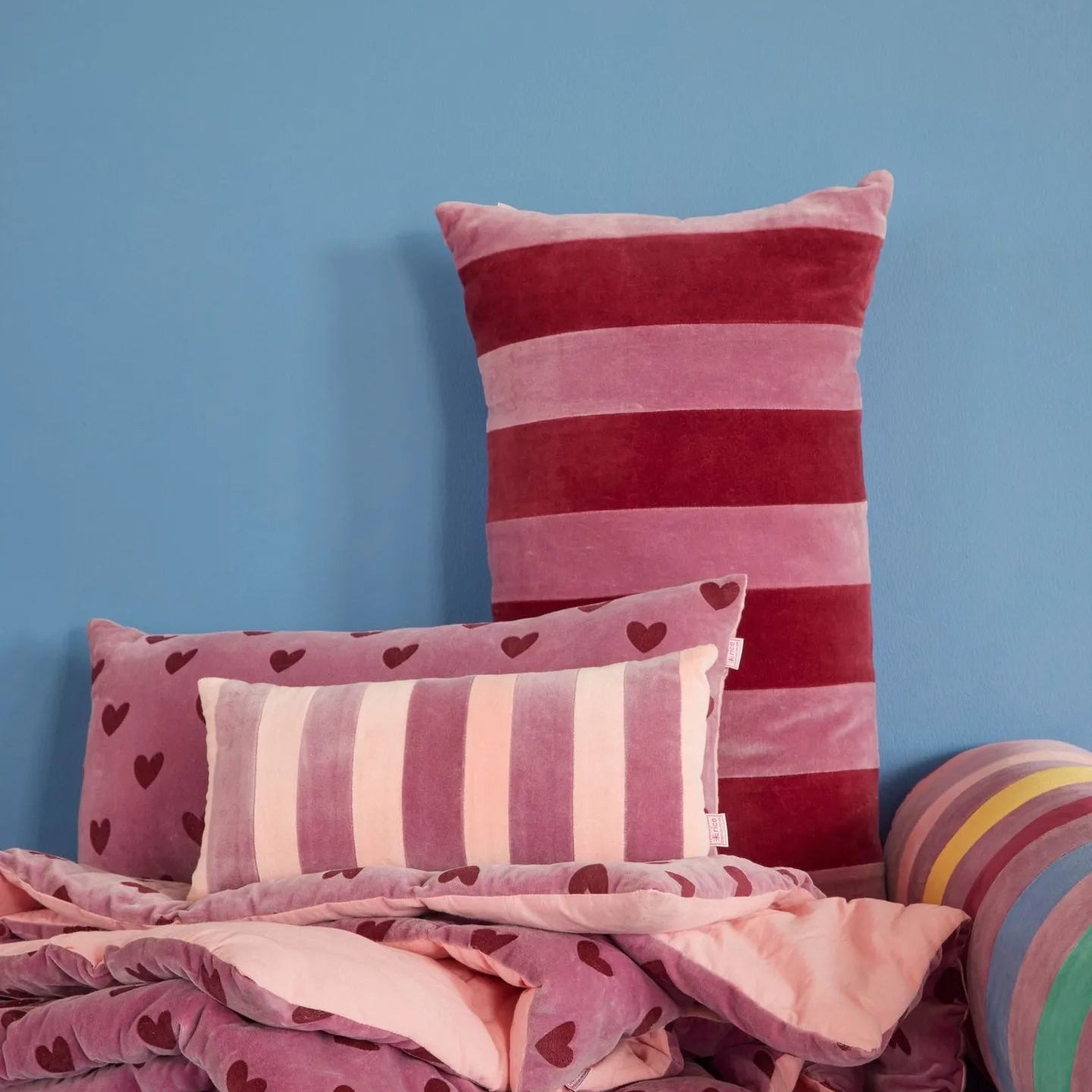 Das Rice Velvet Kissen ist ein rechteckiges großes Kissen mit einem breit gestreiften Muster in zwei herrlichen Farben auf der Vorderseite und einer einfarbigen Rückseite.