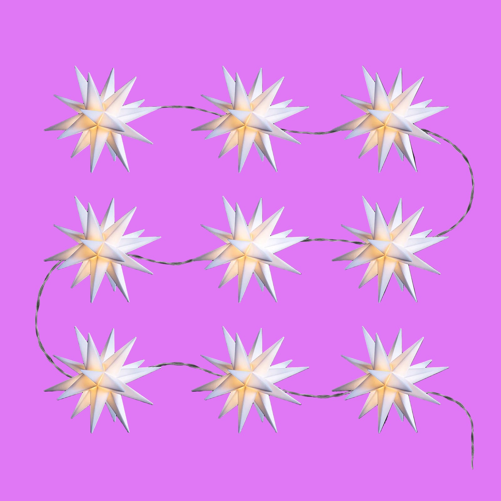 Jeder Stern hat 18 Zacken und einen Durchmesser von 8 cm. Die Gesamtlänge beträgt 8 m, mit einem Abstand von 0,5 m zwischen den Sternen. Inklusive transparentem Trafo, Befestigungsclips und einem 4 m langen Anschlusskabel (Schutzklasse IP44).